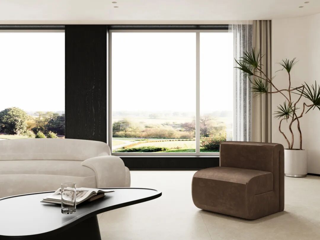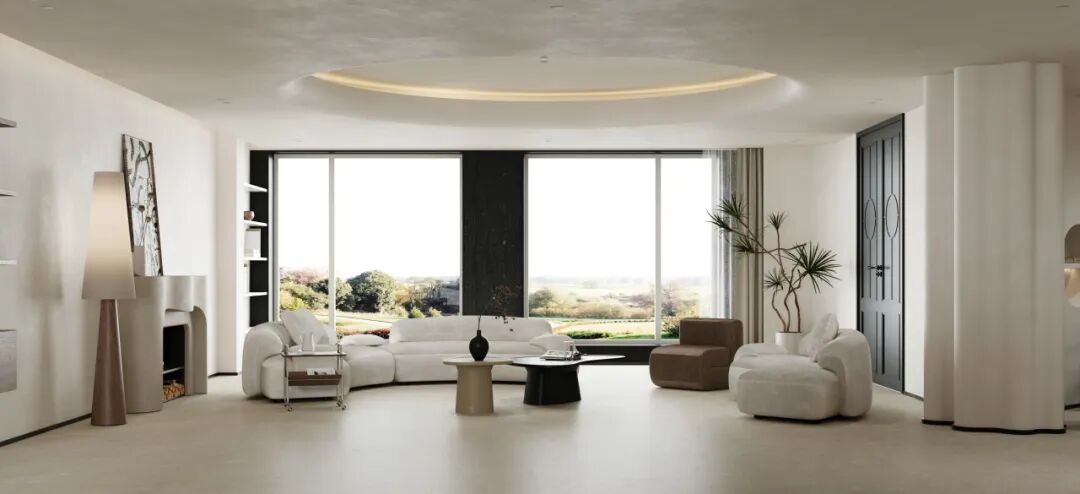 搭配落地玻璃窗和弧形吊顶的设计,让空间增添一份柔软。浅色系质感家具,就像是电影中的画面,慵懒舒适。