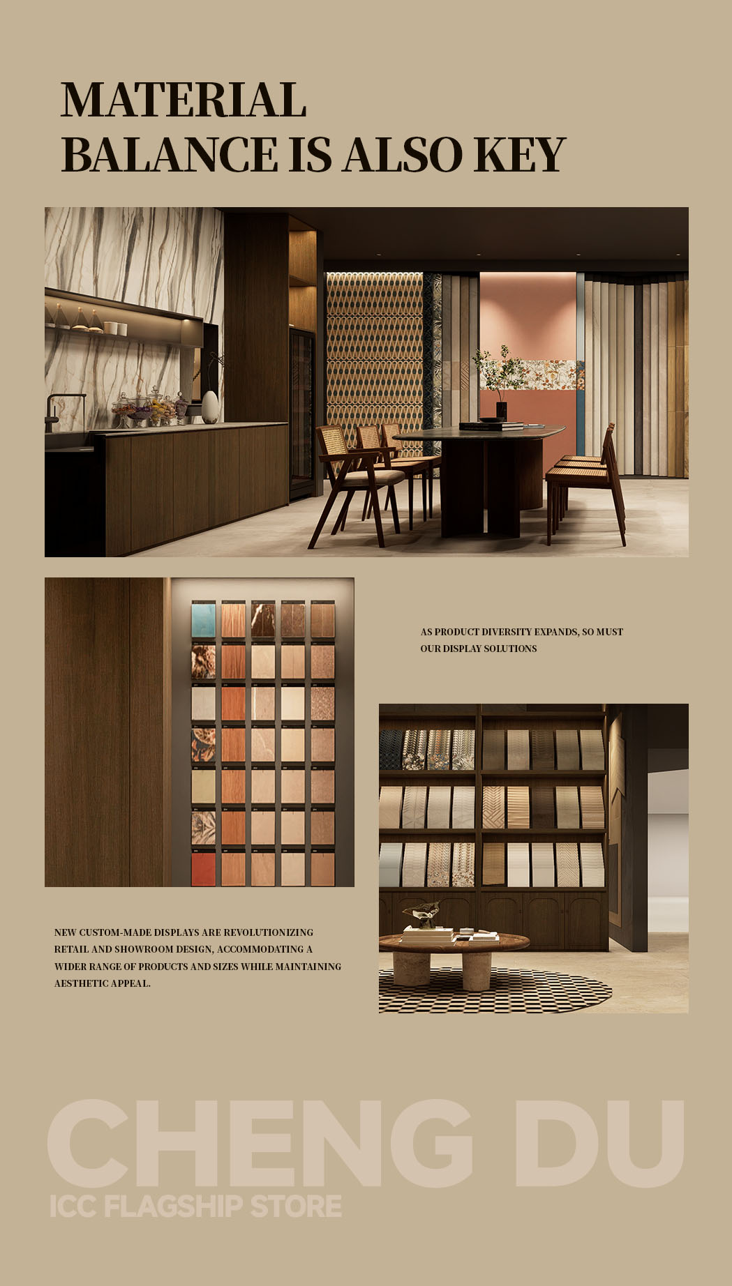 作为国际高端瓷砖岩板品牌、进口瓷砖岩板品牌、北美高端瓷砖岩板品牌、原创设计瓷砖岩板品牌,ICC瓷砖岩板始终致力于将全球设计趋势与当代美学相结合。ICC瓷砖岩板成都展厅游园式全新呈现,标志着品牌从"产品供应商"向"空间美学策展者"的进阶。