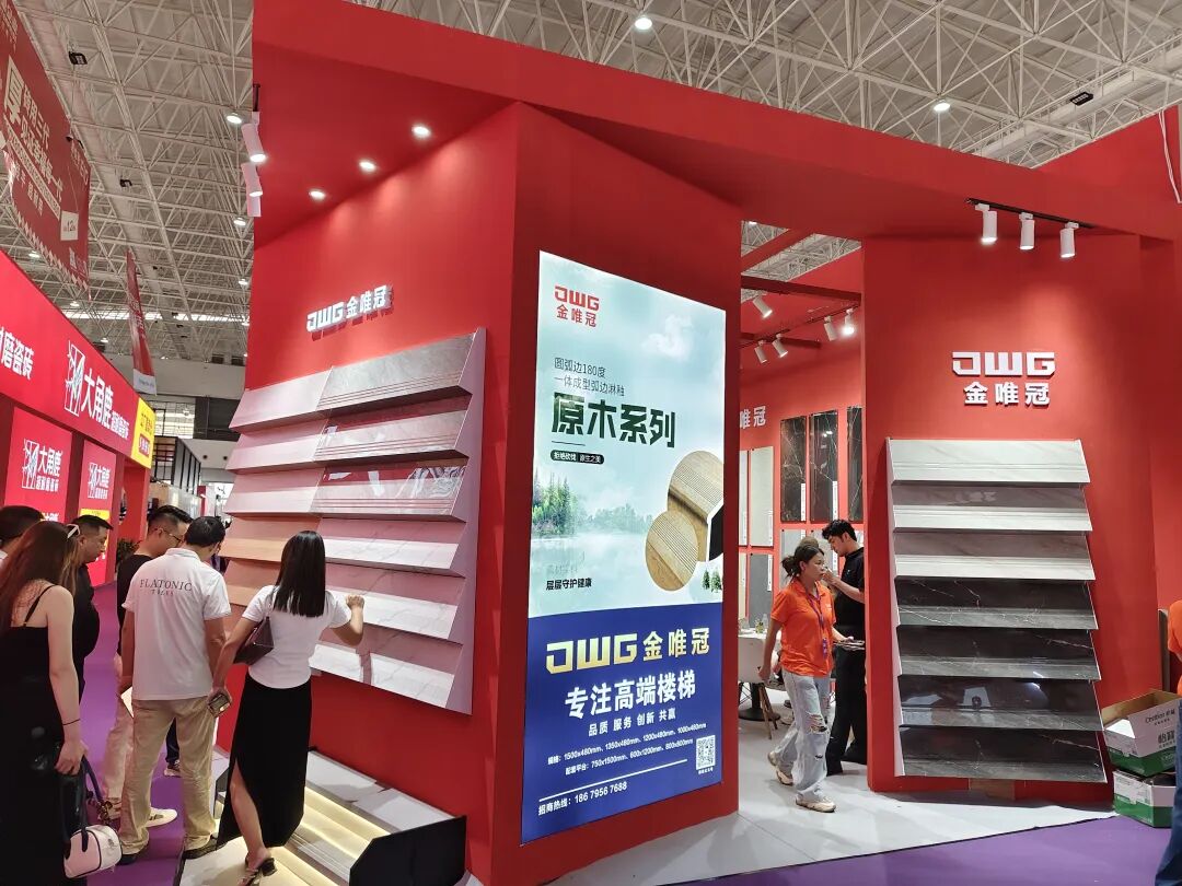华岳&金斯威不仅展示的花片款式十分丰富,拼花地毯砖也是琳琅满目,最吸引眼球的,当属其独家专利产品——楼梯踏步。该产品采用弧边上釉一体成型设计,涵盖亮面、镀金及木纹三类,防滑槽设计与多样化规格,可满足不同风格的装饰需求。