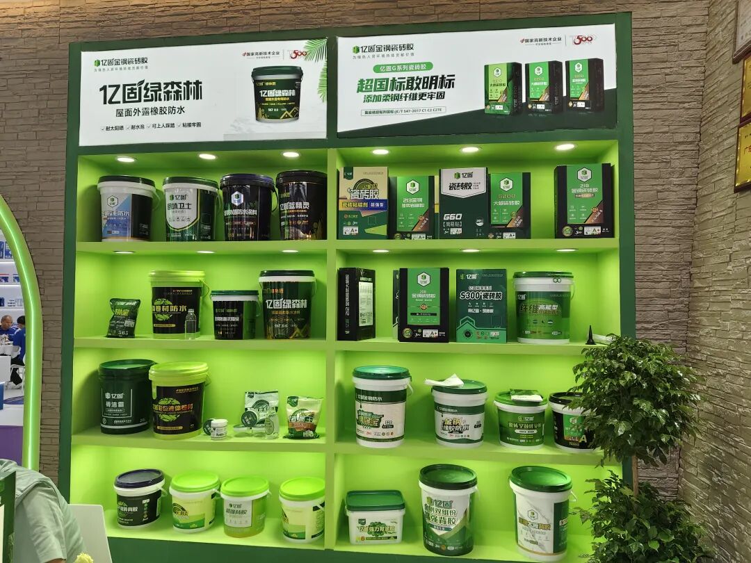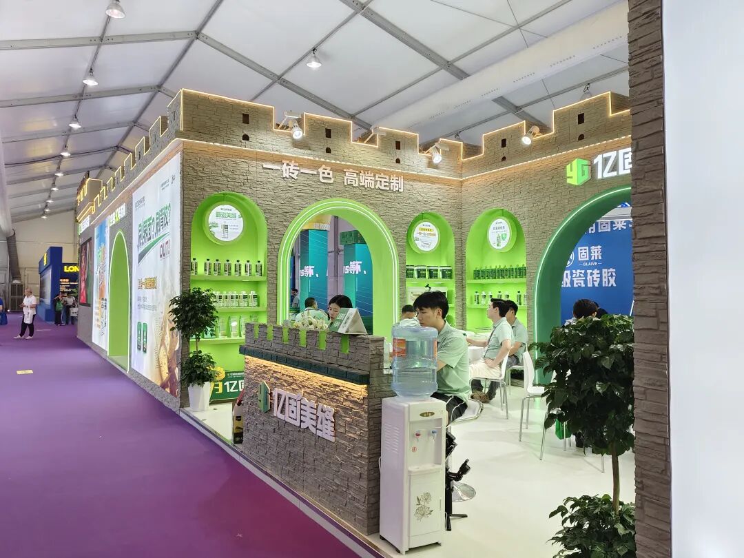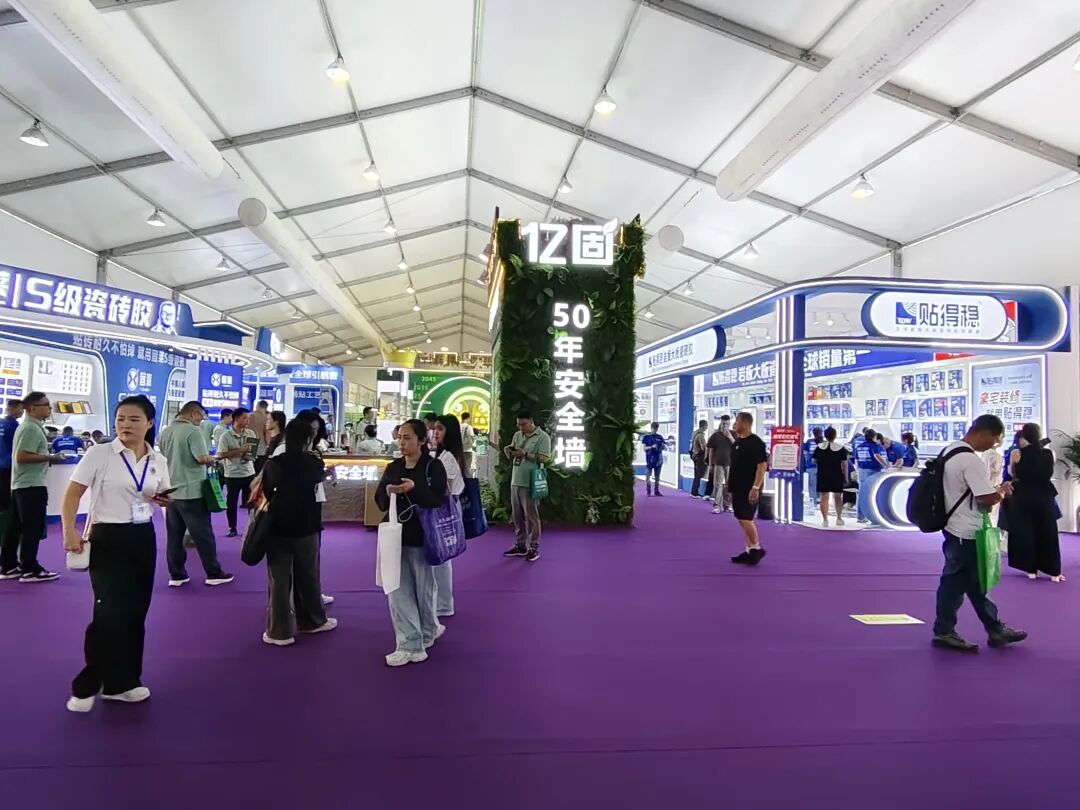 辅材展示区,聚集了唐姆、亿固、贴得稳、固莱、粤贴稳、千大大、涂小二、好霸等品牌,带来了瓷砖胶、防水剂、展架、胶粘剂、辅料等各类产品,展示不同辅材产品在瓷砖铺贴、装饰施工等领域中的创新应用与解决方案。