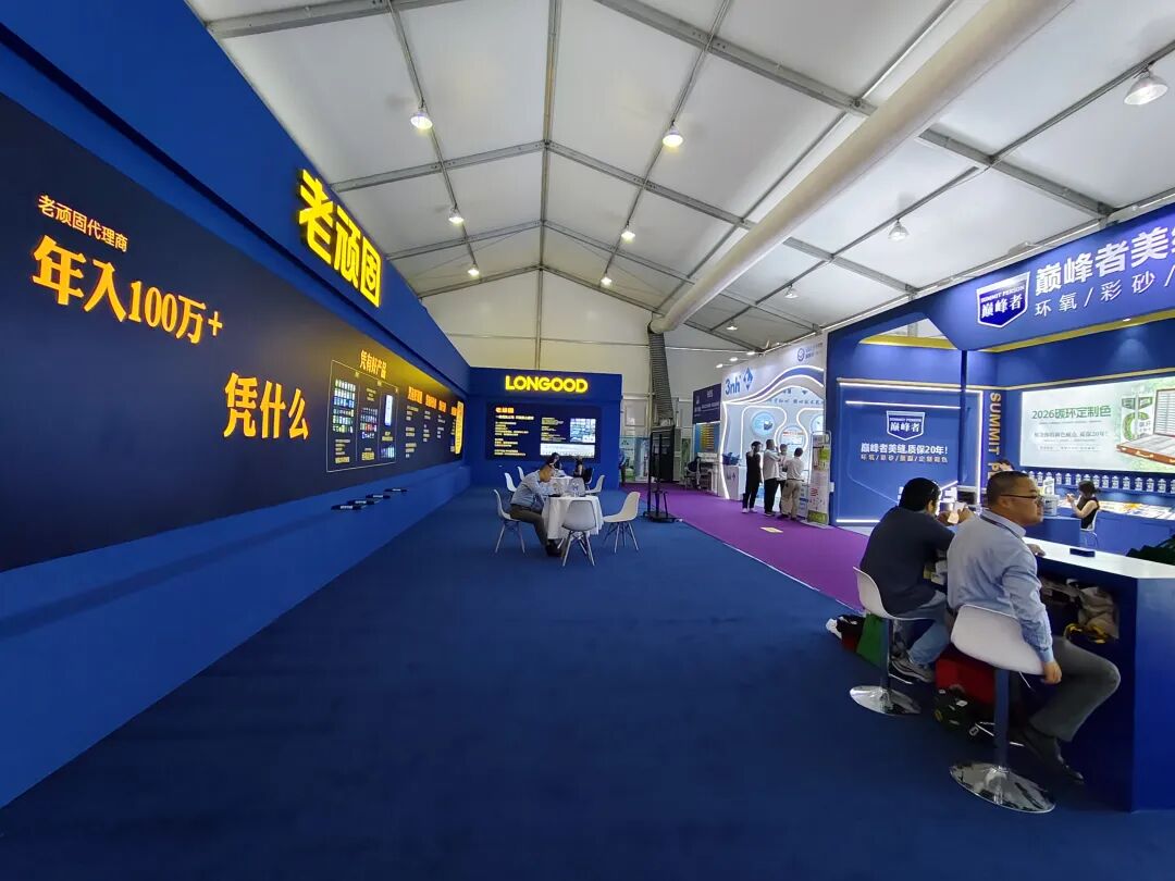 美缝品牌展区则汇聚了老顽固、巅峰者、科达云石、帝斯固等多家品牌。展示范围涵盖了环氧美缝剂、环氧彩砂、氢化美缝剂、聚脲美缝剂、美容胶、上下游原材料、设备以及专用配套工具等全产业链产品品牌。