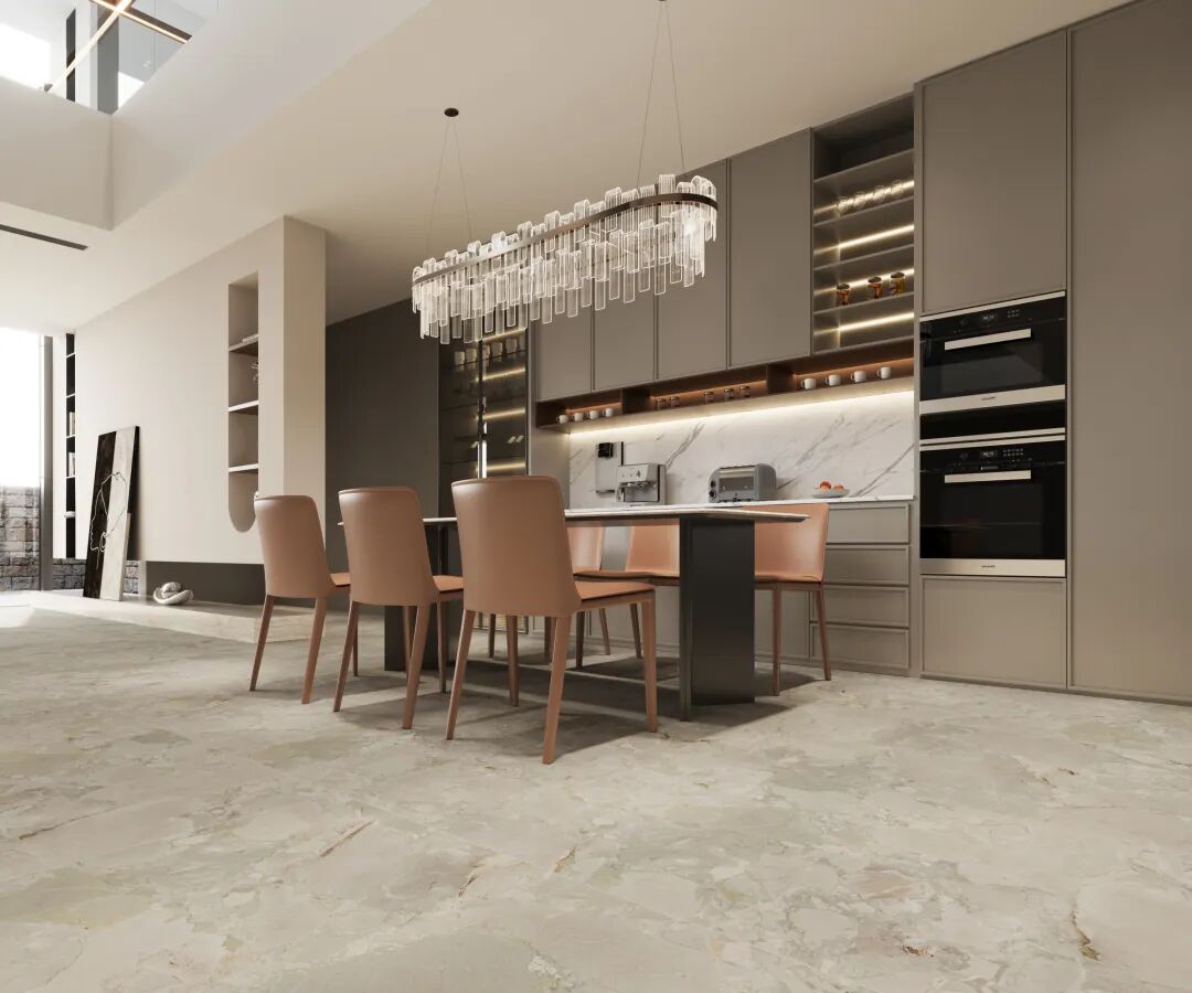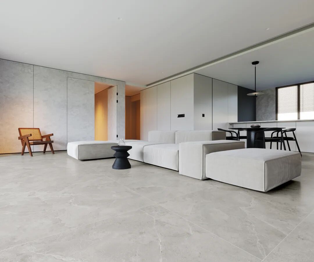 这种特殊工艺同时赋予砖面25°的自然石光,在室内不同光照条件下,瓷砖能保持恰到好处的视觉舒适度,不会产生刺眼反光,同时又能适当保持舒适光感亮度营造出和谐的生活场景。