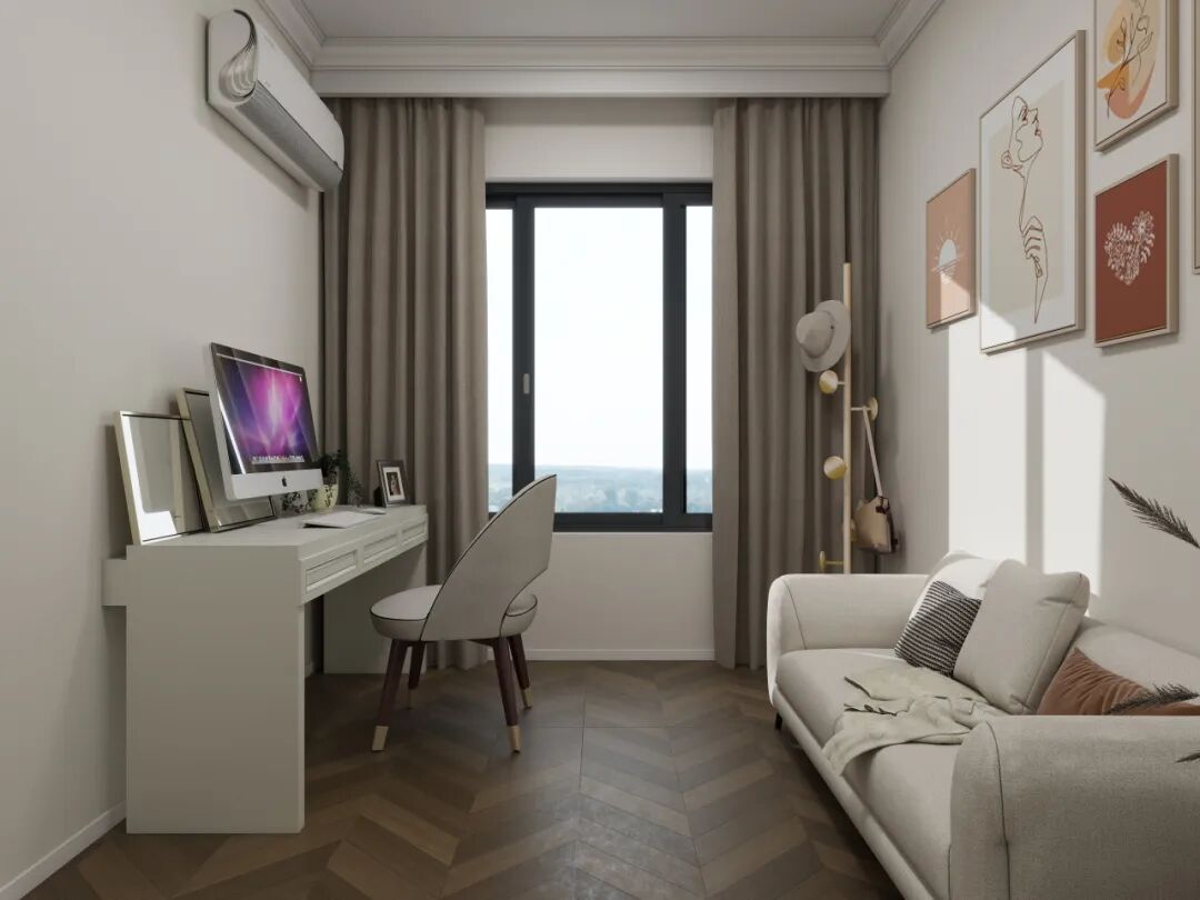 全屋呈现出现代简约轻奢风格:以浅白、浅米色为基底,搭配低饱和度的软装,线条简洁利落。全屋选用“韵·臻石-JDQ88626G”,纹理细腻自然,亮面质感呼应了 “轻奢” 定位,让空间在简约干净的基础上,多了一份精致的光泽感。