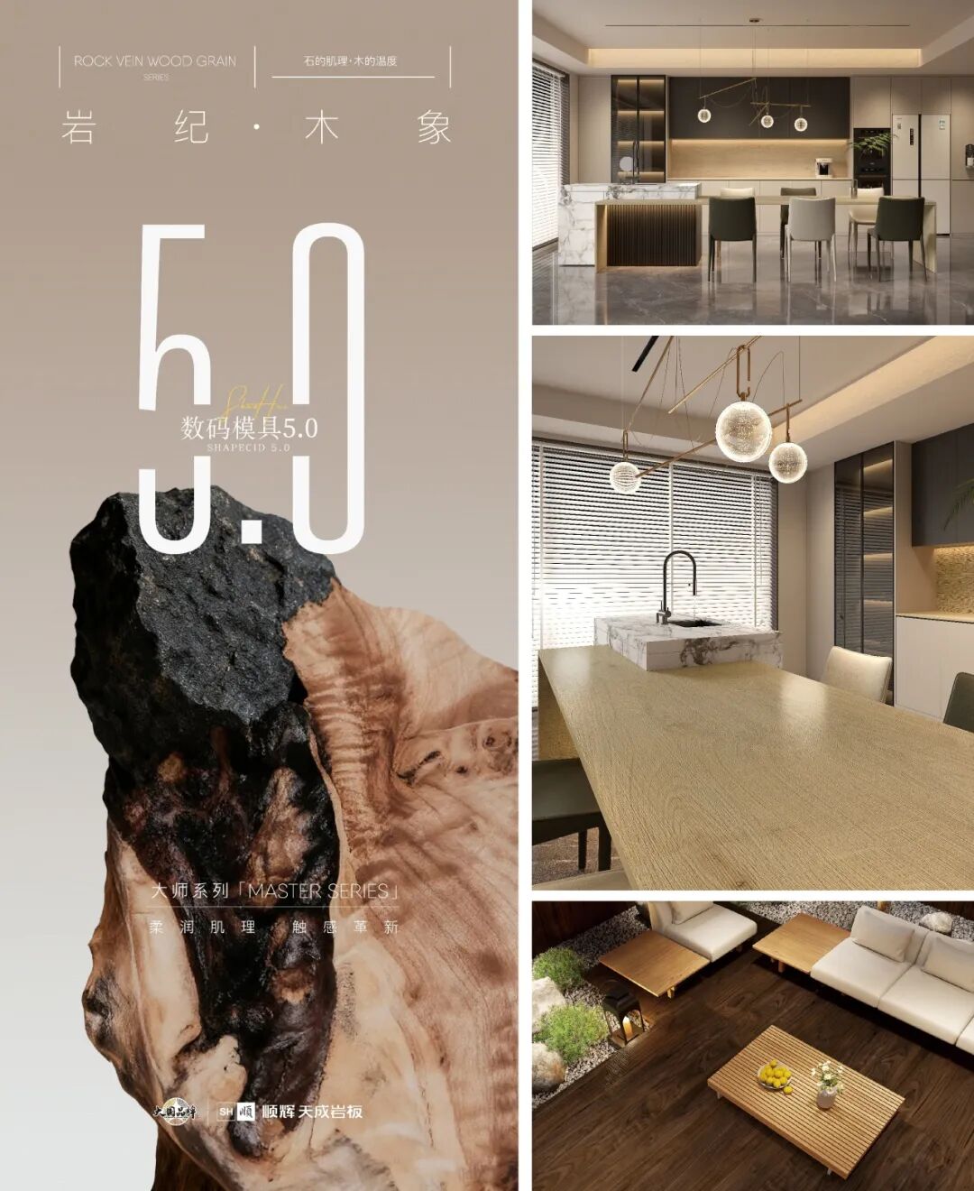 顺辉天成岩板《大师系列》包括岩纪木象天工石意两大子系列,深度融合数码模具5.03D团絮干粒抛等前沿工艺,实现了岩板“肌理造骨”与“立体景深”效果的突破性呈现。该系列产品以技术还原自然之美,将石材的磅礴与木材的温润刻画得淋漓尽致,重新定义了高端岩板的美学与实用价值。