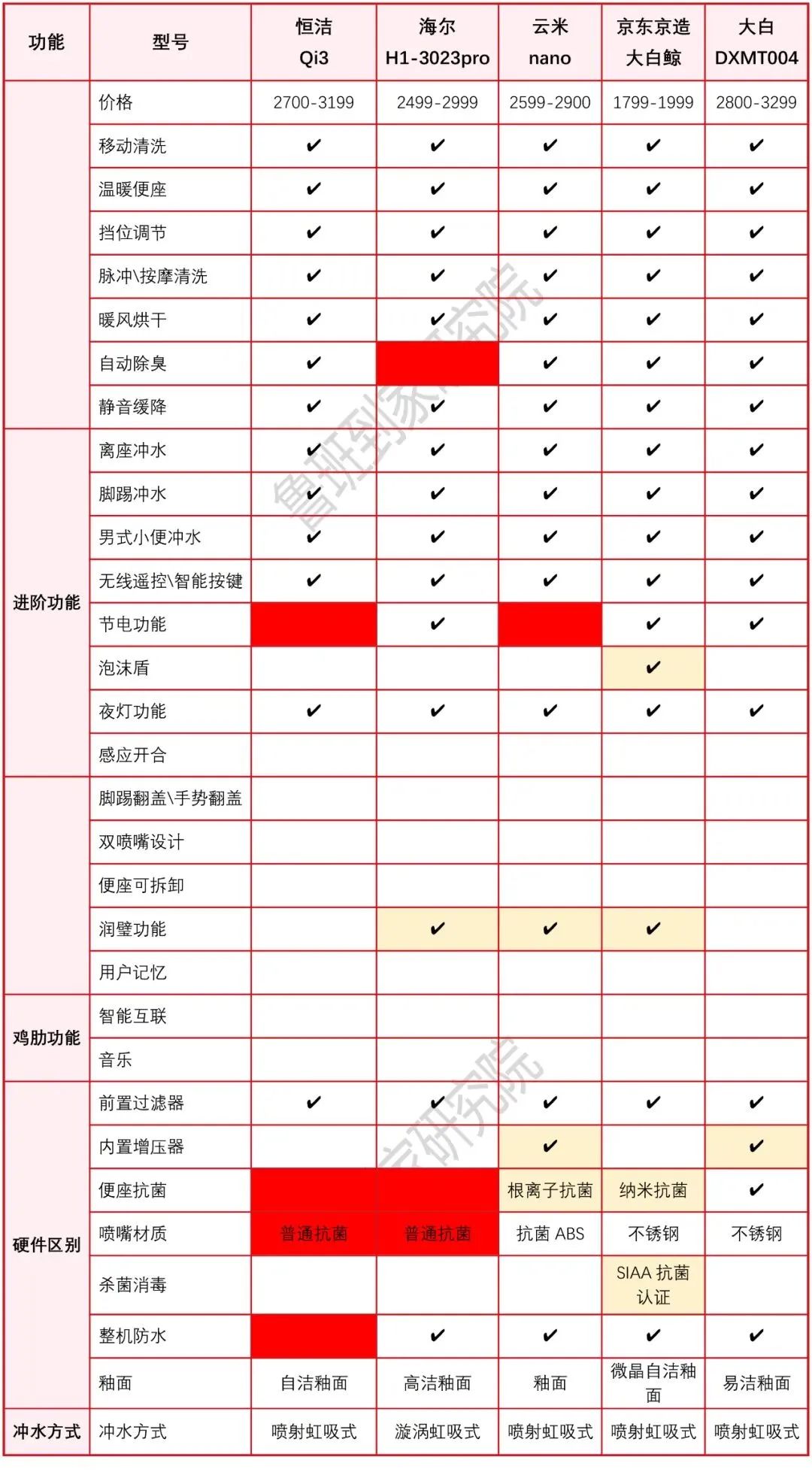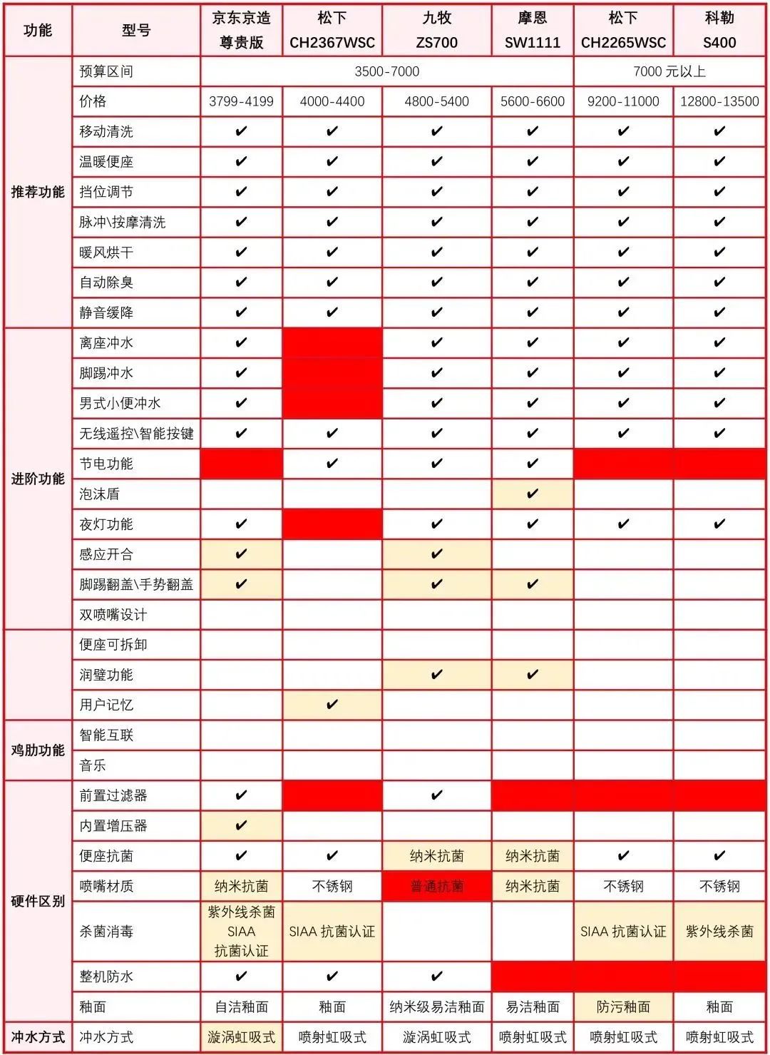 △ 智能马桶功能、硬件对比图(3500元以上预算区间)