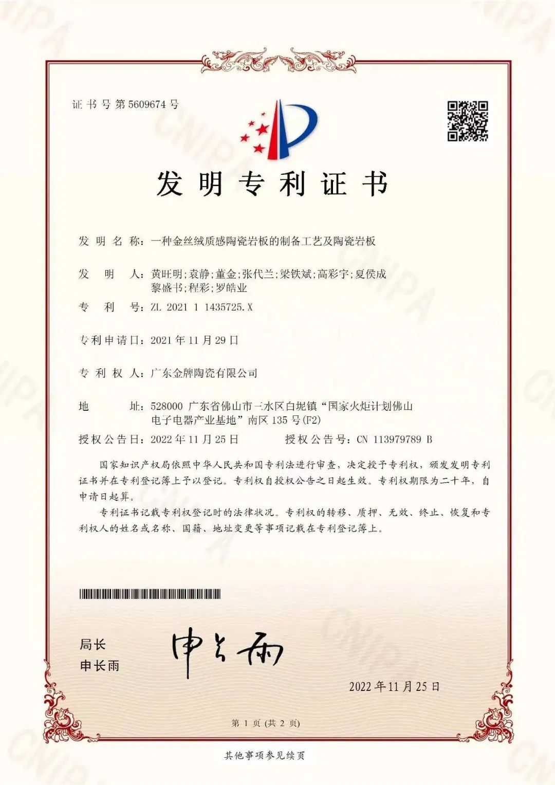 根据这位博主的描述,其实我们很容易就猜测到,天鹅绒或者说金丝绒最早是由金牌企业研发推广的,两个品牌分别是金牌亚洲和德利丰。据了解,这两个品牌推出相关产品是在2020年初岩板在国内最火的时候。金牌亚洲还拥有金丝绒柔光砖的独家产品技术专利,名为“一种金丝绒质感陶瓷岩板的制备工艺及陶瓷岩板”。该专利证书由国家知识产权局于2022年11月25日颁发,证书内容显示,金牌亚洲是在2021年11月29日申请的。