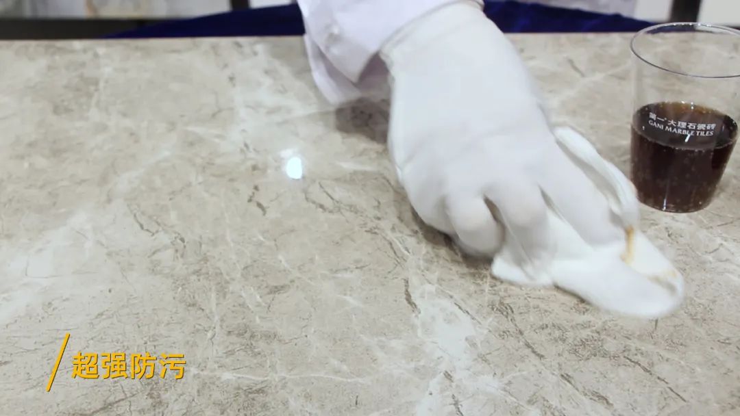 得益于吸水率低和瓷砖表面平整光亮的特性,简一云朵灰拥有极强的防污抗渗透性能。测评小组在简一云朵灰表面制造可乐、咖啡和白板笔字迹等日常生活中常见的污渍,再用锋利的钢刷用力刮磨瓷砖表面。静置10分钟后,用润湿的抹布轻轻一擦,瓷砖表面依旧光洁如新,没有被污渍渗透的痕迹。