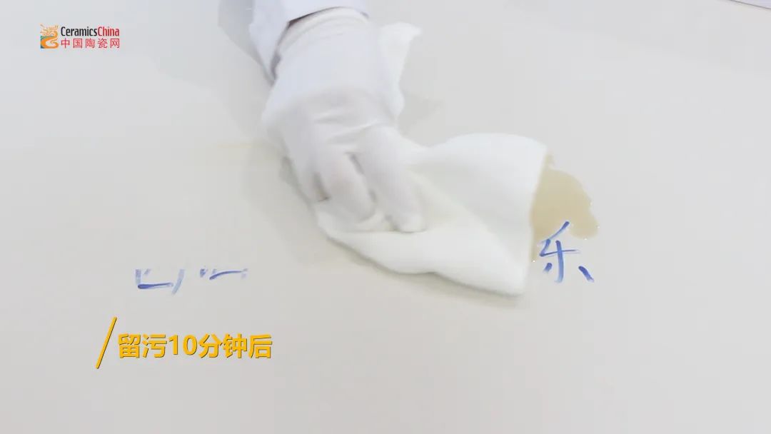 超低的吸水率说明欧福莱岩板瓷砖高度致密,这也意味着普通污渍根本无法渗透其表面,同时不会滋生细菌。测评人员在产品表面分别倒上可乐和酱油,并用水彩笔写字标注,静置几分钟后,用润湿的抹布轻轻一擦,所有污渍全部都可擦去,产品表面依旧光洁如新。