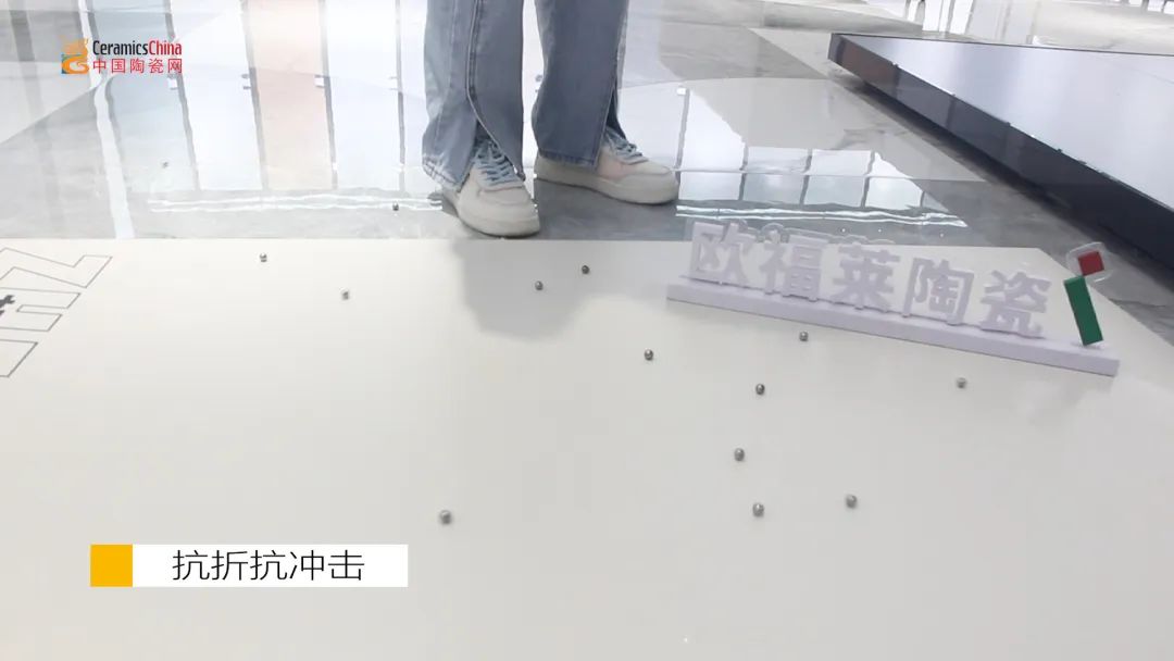 生活中经常会遇到重物掉落地面的情况,例如玻璃杯、陶瓷碗等,这种情况考验的就是地面的抗冲击性能。欧福莱岩板瓷砖硬度高,具有很强的抗冲击性。为了测试其抗冲击性能,测评人员将一把小钢珠从离地面1米高的位置掉落产品表面,并重复多次,随后观察其表面。发现产品表面没有出现崩角碎裂的情况。