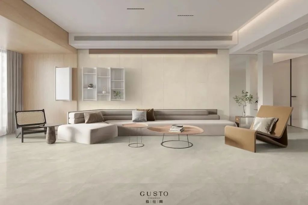 格仕陶丝光绒系列新品汲取时尚高级的丝绒面料为灵感,设计出圣洛菲、贝尼尼、暮云纱、加州米黄、苏月白、帕瓦蓝灰等11款产品,涵盖了90×1800㎜、750×1500㎜、600×1200㎜三大尺寸。